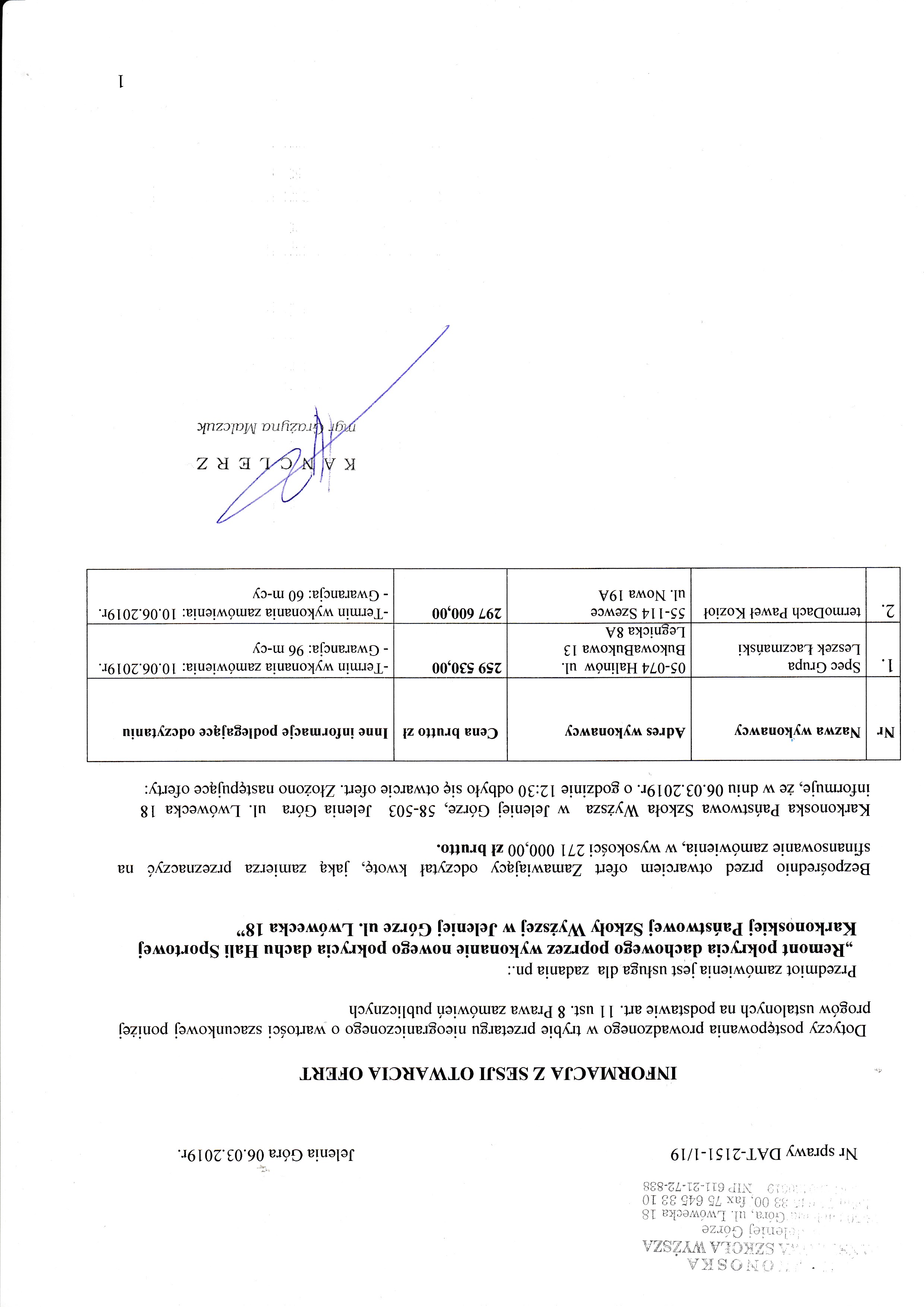 Dokument z dnia: 11.03.2019, 14:12 Dokument oglądany razy: 585 Przetarg zakończony nierozstrzygnięty Przetarg podlega Ustawie: tak |